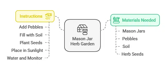 - Materials Needed: Mason jars, pebbles for drainage, soil, and herb seeds.
