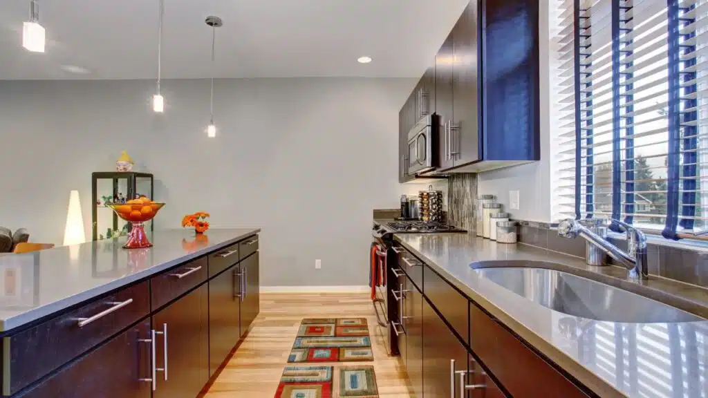 Pair black or deep navy walls with light-colored furniture or vice versa. Use contrasting elements, such as white kitchen cabinets against a dark backsplash or dark hardwood floors with light area rugs.