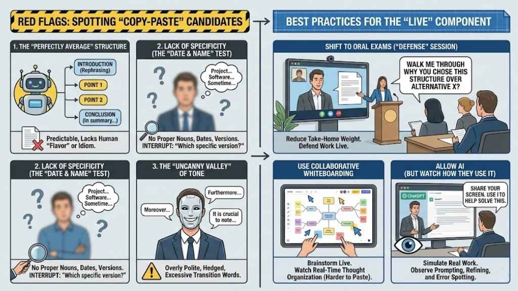 Even with these questions, you need to be observant. If you are conducting a remote interview or reviewing take-home assessments, look for these signs that the candidate is over-relying on AI without adding human value.