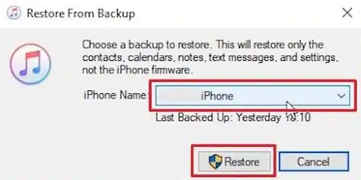 Another useful and native method is to retrieve data from an iTunes backup. It lets you restore all data and settings directly from your computer’s saved copy. Since this method restores all data at once, selective restore is not possible. Another drawback is backup overwriting, where new files replace older ones during recovery. Anyway, go through the given steps to find out how you can restore iTunes backup: