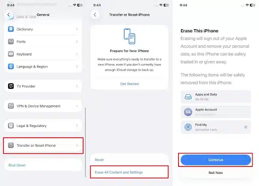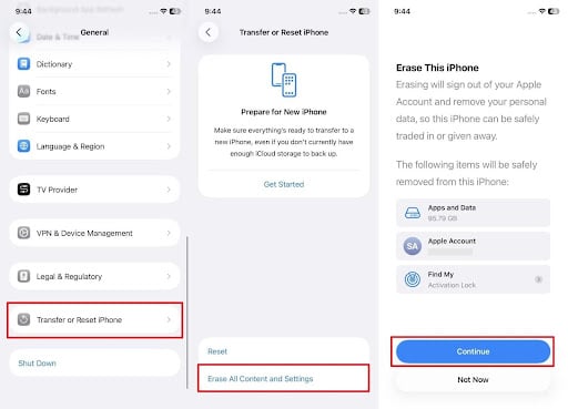 Step 1. Upon heading to the “General” section from the phone’s settings, tap the “Transfer or Reset iPhone” option. Then, choose “Erase All Content and Settings” and hit the “Continue” button.