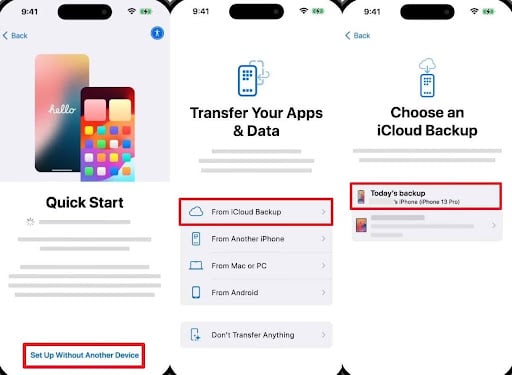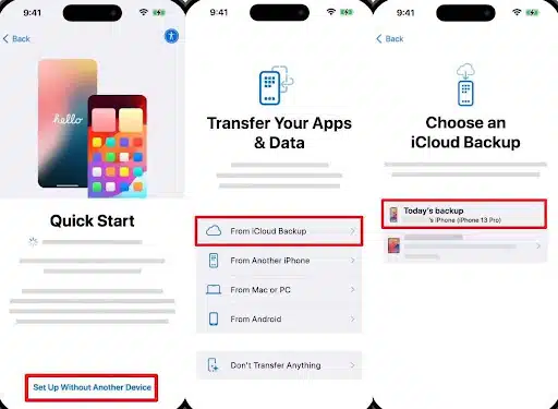 Step 2. Afterward, set up your iPhone and tap the “Setup Without Another Device” option from the “Quick Start” screen. Opt for “From iCloud Backup” to sign in to your Apple Account and choose “Backup” to restore.