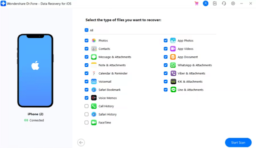 Step 2. Link Your Phone and Select Data Files: Following this, link your iPhone to the computer and let the tool detect it. Subsequently, choose the data types you want to recover and hit the “Start Scan” button.