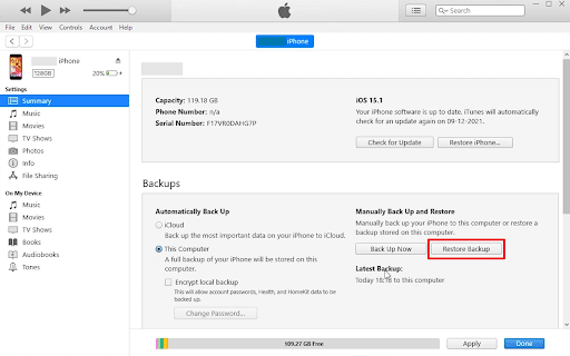 Step 1. To initiate, link your iPhone to the computer and then run the “iTunes” program. Go ahead and press the “Restore Backup” button under the “Backups” section.