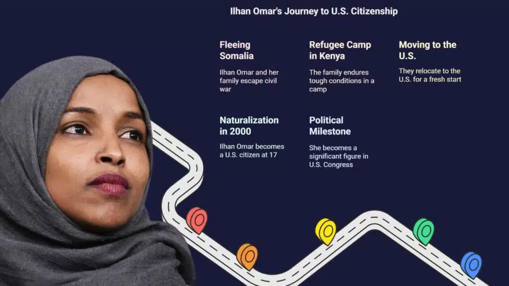 Ilhan Omar moved from Somalia and became a U.S. citizen in 2000 at age 17. This allowed her to vote and enjoy freedoms in the United States. She later made history as a Somali American woman in the U.S. Congress.