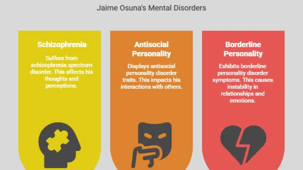 Jaime Osuna is still alive. He is held in Salinas Valley State Prison’s psychiatric program in California. Officials moved him there after mental health evaluations. Reports say he suffers from schizophrenia spectrum disorder, antisocial personality disorder, and borderline personality disorder.