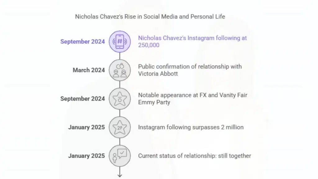 As of January 2025, Nicholas Chavez and Victoria Abbott continue to be in a relationship. While they maintain a relatively private personal life, they occasionally share moments together on social media and attend industry events as a couple.