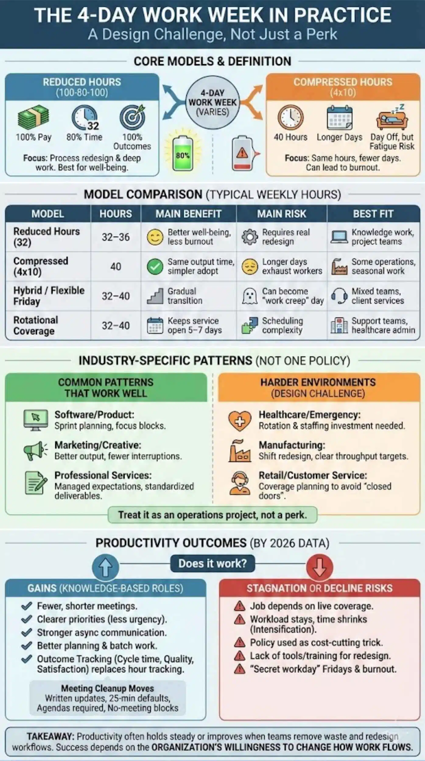 The takeaway: the four-day week is not one policy. It is a design challenge. The organizations that succeed treat it like an operations project, not a perk.