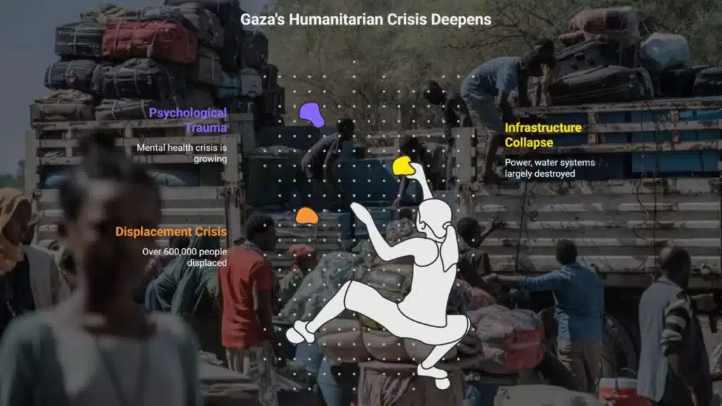 - Infrastructure collapse: Power, water, and sewage systems in northern Gaza are largely destroyed. Southern areas now face overcrowding and worsening sanitary conditions.