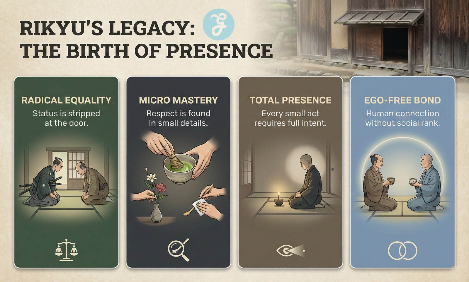 By designing the tea house with a door so low that even a powerful Samurai had to crawl inside, Rikyu stripped away status. This was the Nijiriguchi. He created a space where the only thing that remained was an honest connection. Inside the tea room, there were no generals or peasants. There were only human beings sharing a bowl of tea.