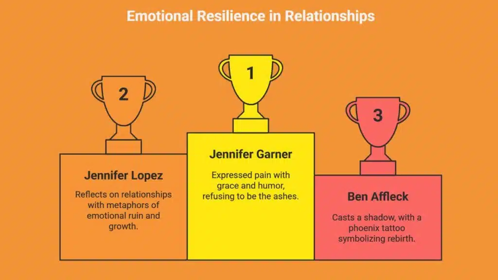 The parallels between Lopez’s lyrics and Garner’s quotes are hard to miss. Both women appear to reflect on relationships with Affleck using metaphors of emotional ruin—ashes and wreckage—but also emphasize resilience and personal growth.
