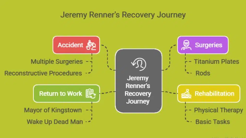 Following the accident, Renner underwent multiple intensive surgeries, including reconstructive procedures on his face, legs, and chest. Titanium plates and rods were inserted into his body to restore shattered bones.