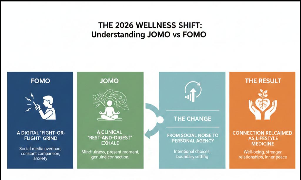 In 2026, the global wellness community is witnessing a fundamental shift in its North Star. For years, the industry was driven by a hyper-connected, data-obsessed pursuit of “more”: more followers, more bio-data, and more attendance. However, the recent Global Wellness Summit 2026 Report confirms a massive consumer rebellion: Why JOMO outperforming FOMO in 2026 wellness trends has become the central pillar of modern health. We have reached a “Digital Saturation Point” where the Joy of Missing Out is no longer a niche lifestyle choice; it is a clinical necessity for a population suffering from chronic nervous system exhaustion.