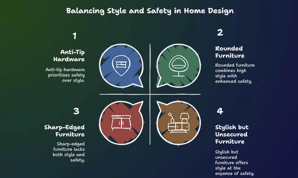 - Choose soft, rounded furniture like tufted ottomans and curved chairs to keep kids safe and add style. Use anti-tip kits for big items such as dressers and bookcases.