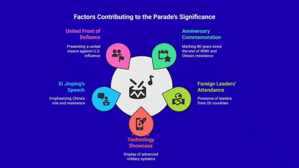 - The event is expected to showcase China’s newest military technology, including advanced missile systems, stealth aircraft, and drones.