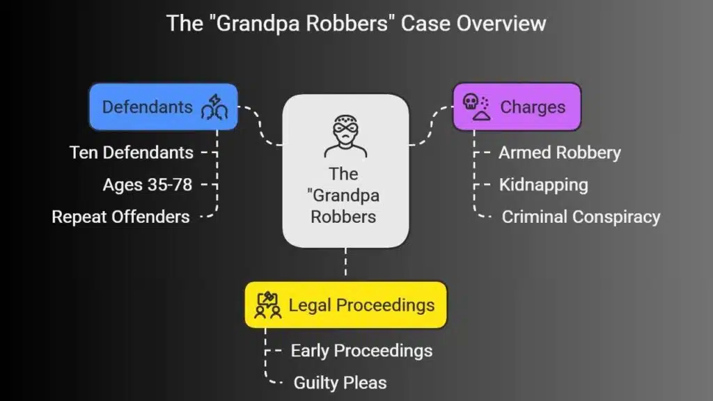The accused group of burglars—nicknamed the “Grandpa Robbers” due to their ages—includes ten defendants, mostly men between the ages of 35 and 78. Twelve were originally arrested. One has since passed away, and another, who suffers from Alzheimer’s disease, was deemed unfit to stand trial.