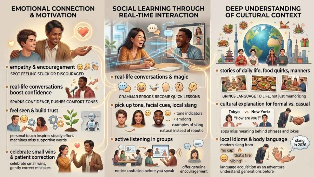 Real-life conversation is more than repeating words or perfecting grammar exercises. It is about reading body language, feeling surprise or humor, and picking up on sarcasm. These are little things only a person catches in real time.