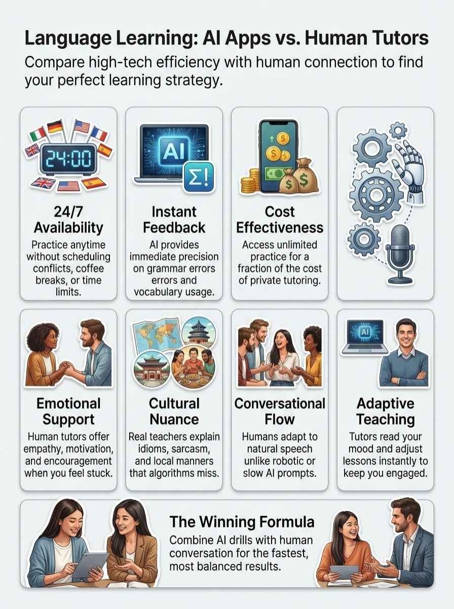 Choosing between AI language apps and human tutors is like picking between a fast train and a friendly guide on your journey to fluency. Both get you moving, but in different ways.