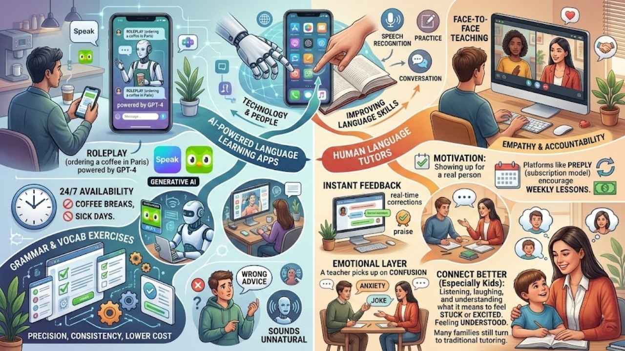 Tutors catch subtle mistakes that AI might miss and can make learning feel less like a math test and more like chatting at a café. Both methods shape how we pick up new languages but focus on different things: AI delivers precision while people provide heart.