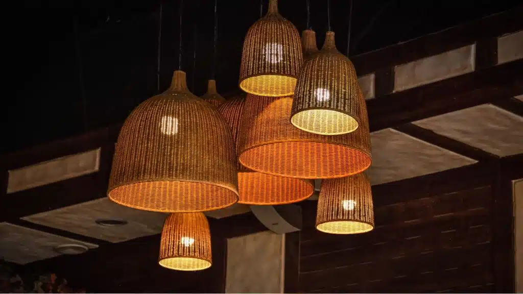 - Choose table lamps or pendant lights with wooden bases or rattan shades.