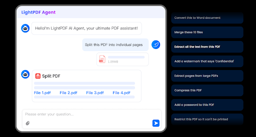 LightPDF isn’t just about isolated features; it’s built as an interconnected platform where the AI Invoice Generator and OCR tools synergize with other AI-driven functionalities to handle comprehensive document lifecycles. At the heart of this is the LightPDF AI Agent, a conversational AI assistant that responds to natural language commands. Simply upload a file and instruct it—like “Extract text from this scan, generate an invoice based on the data, and encrypt the final PDF”—and it orchestrates the tasks seamlessly, eliminating the need to switch between menus or apps.
