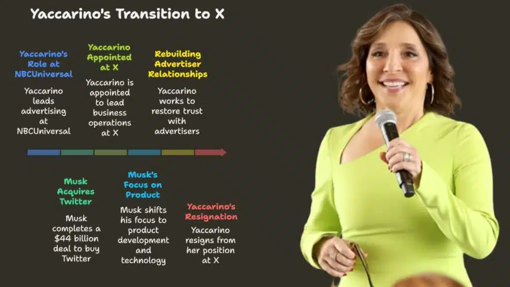Yaccarino joined X in May 2023 after a successful career at NBCUniversal, where she served as the head of advertising. Musk appointed her shortly after acquiring Twitter in a $44 billion deal in late 2022.