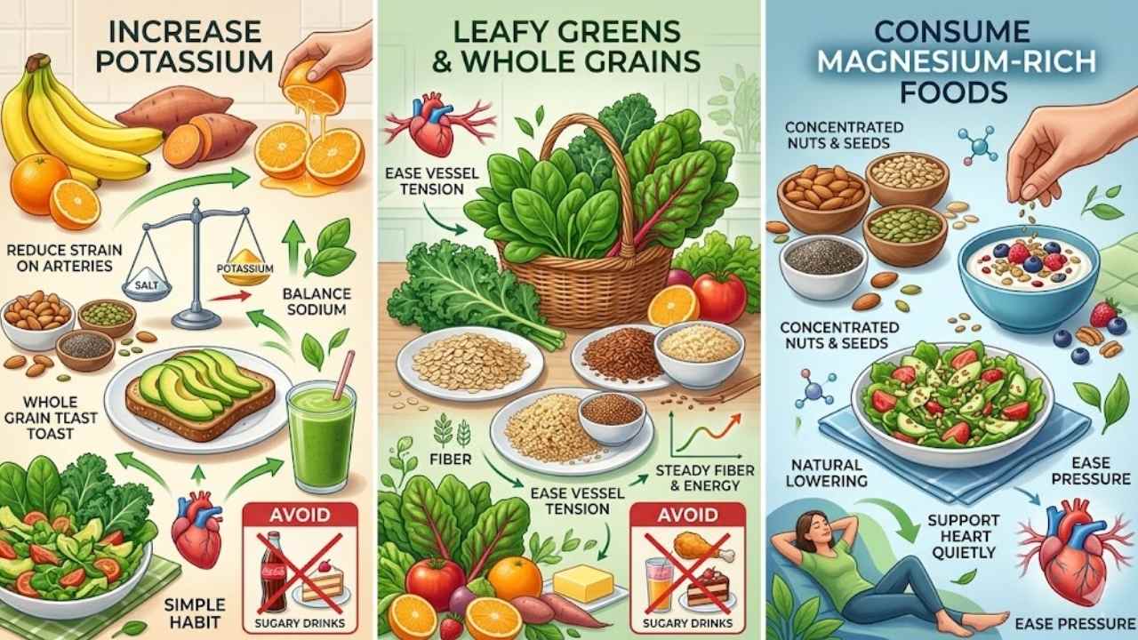 Pair this with avoiding foods high in saturated fat, since those can raise cholesterol and increase blood pressure. Eating plenty of fruits, vegetables, and whole grains while limiting sugar-sweetened beverages and desserts supports natural blood pressure management.