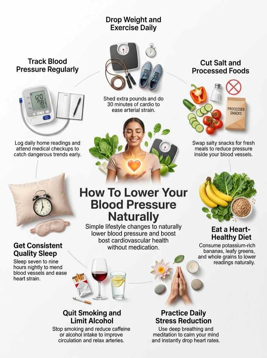 Cut back on salt and sodium; that simple step drops pressure fast. Think of it as giving your arteries a break from the daily grind.