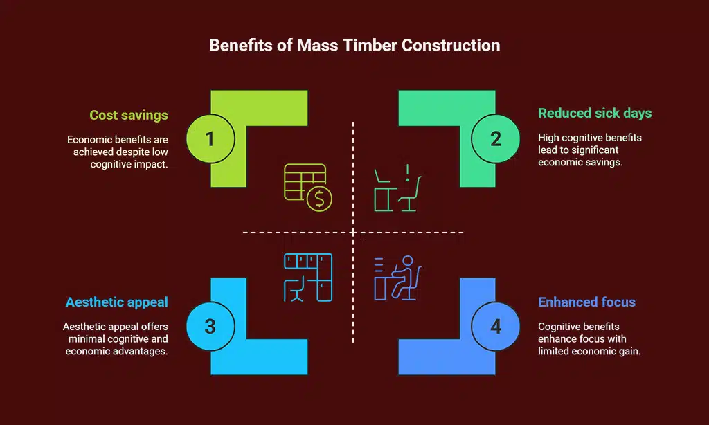 Natural wood panels in mass timber buildings boost mood, and cut stress, thanks to biophilic design ideas. Exposure to engineered wood finishes raises focus and memory. Cross-laminated timber walls soften noise too.