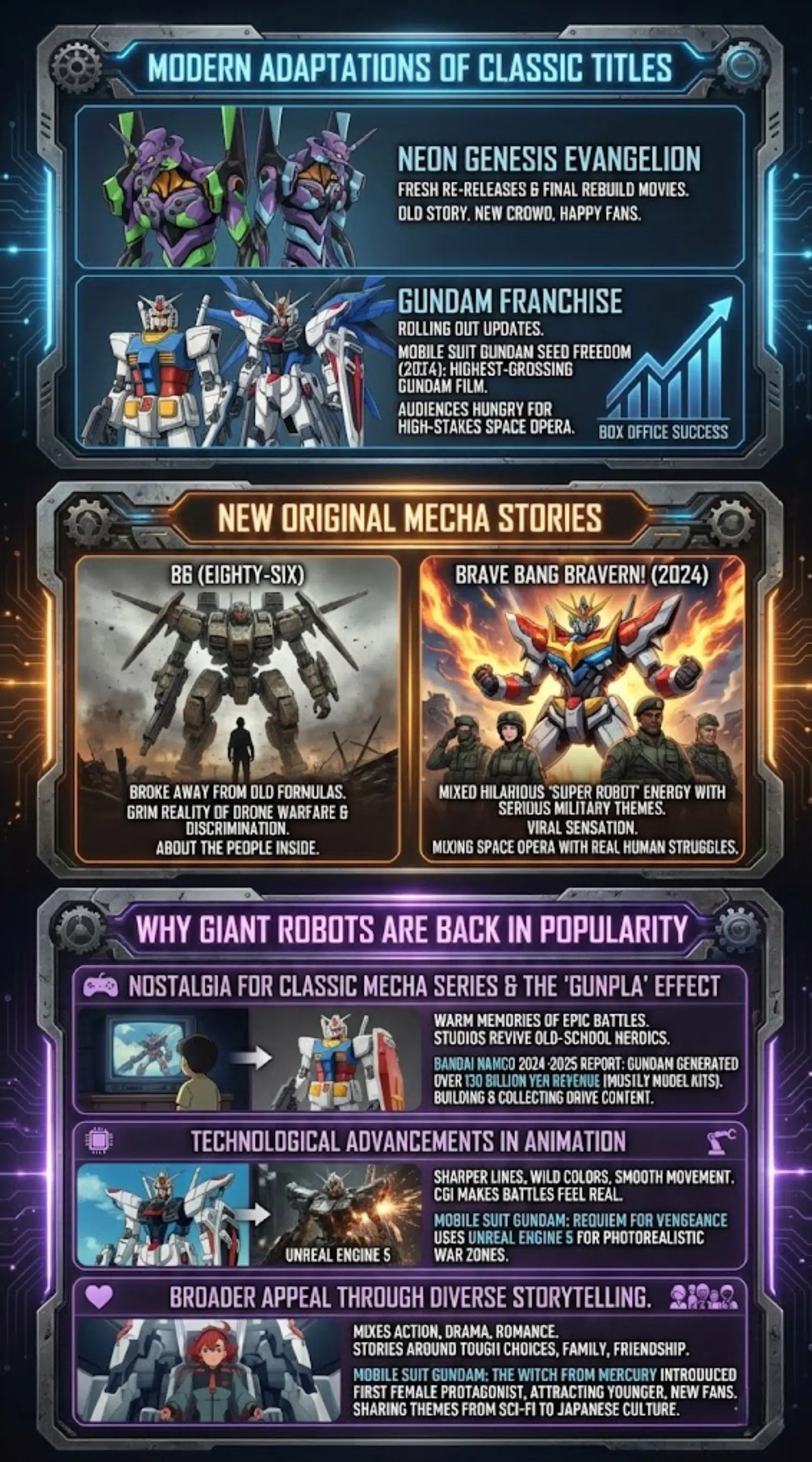 Old mecha series like Gundam and Neon Genesis Evangelion stir up warm memories. Many grew up watching giant robots battle it out. Studios see this longing for old-school heroics mixed with futuristic robotics as an open door to revive the genre.