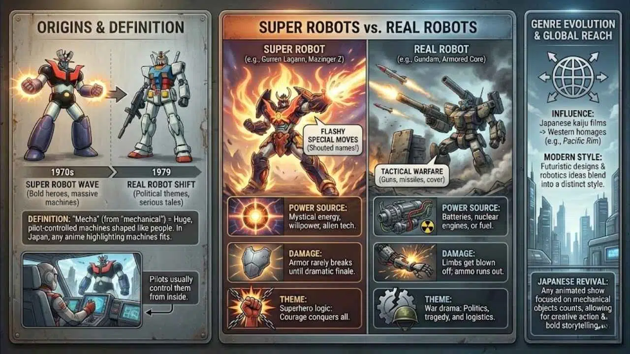 Classic shows like Gundam and Mazinger Z set the stage for today’s stories. The word “mecha” comes from “mechanical,” but it became popular through Japanese pop culture. The first big wave started in the 1970s with “Super Robot” series, featuring bold heroes and massive fighting machines saving Earth from threats.