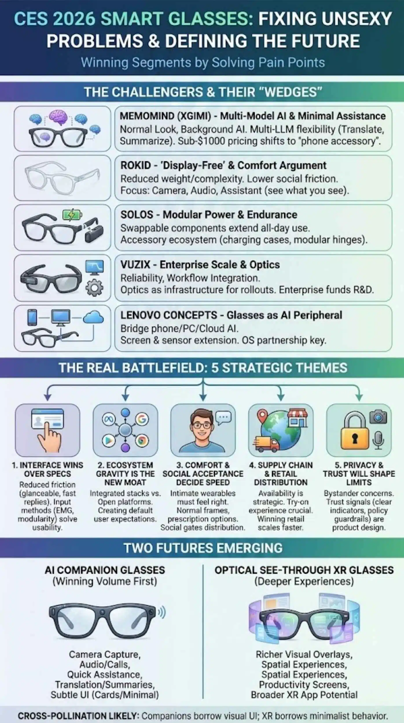 - CES 2026 suggests two product paths will compete in parallel: subtle AI companion glasses and optical see-through XR glasses with richer visuals.