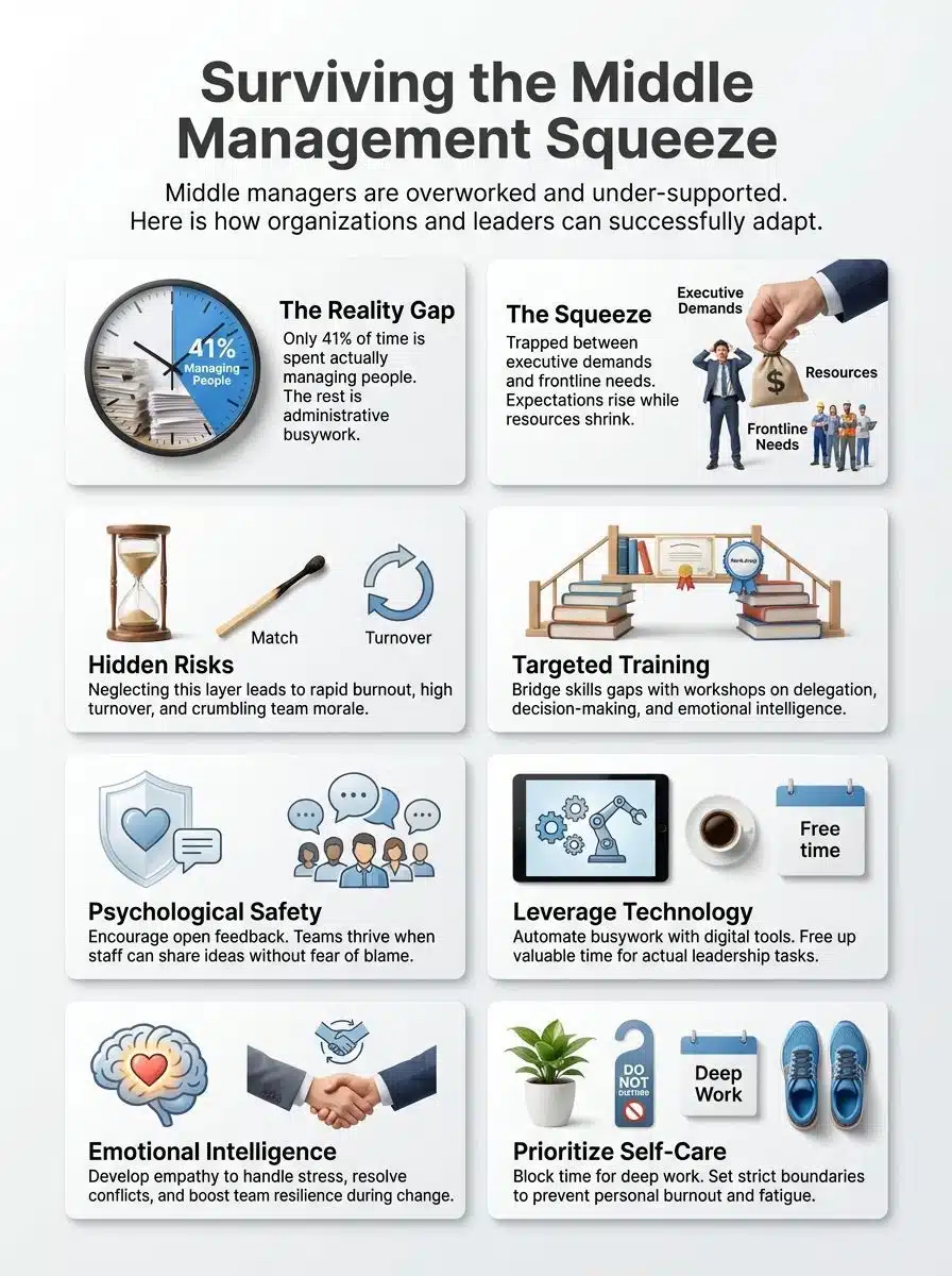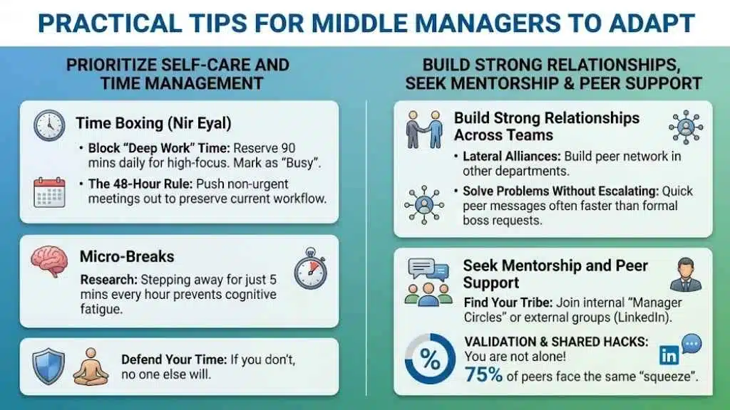 Find your tribe. Whether it is an internal “Manager Circle” or an external group on LinkedIn, connecting with others facing the same “squeeze” validates your experience and provides a safe space to share hacks. You are not alone in this; 75% of your peers are right there with you.