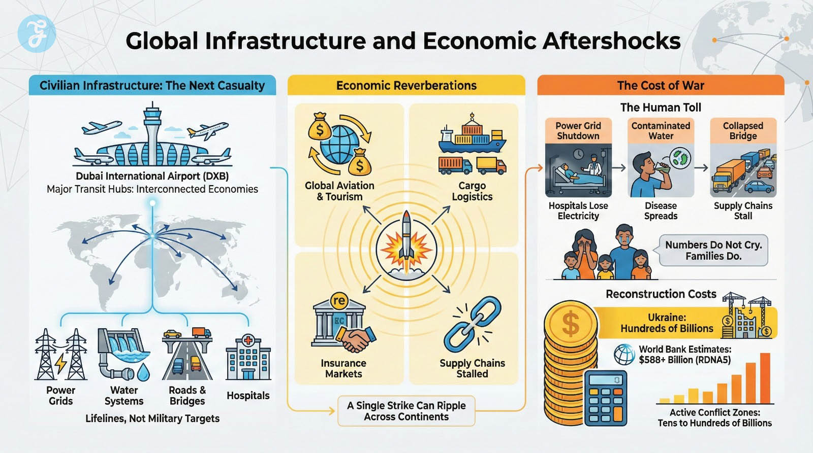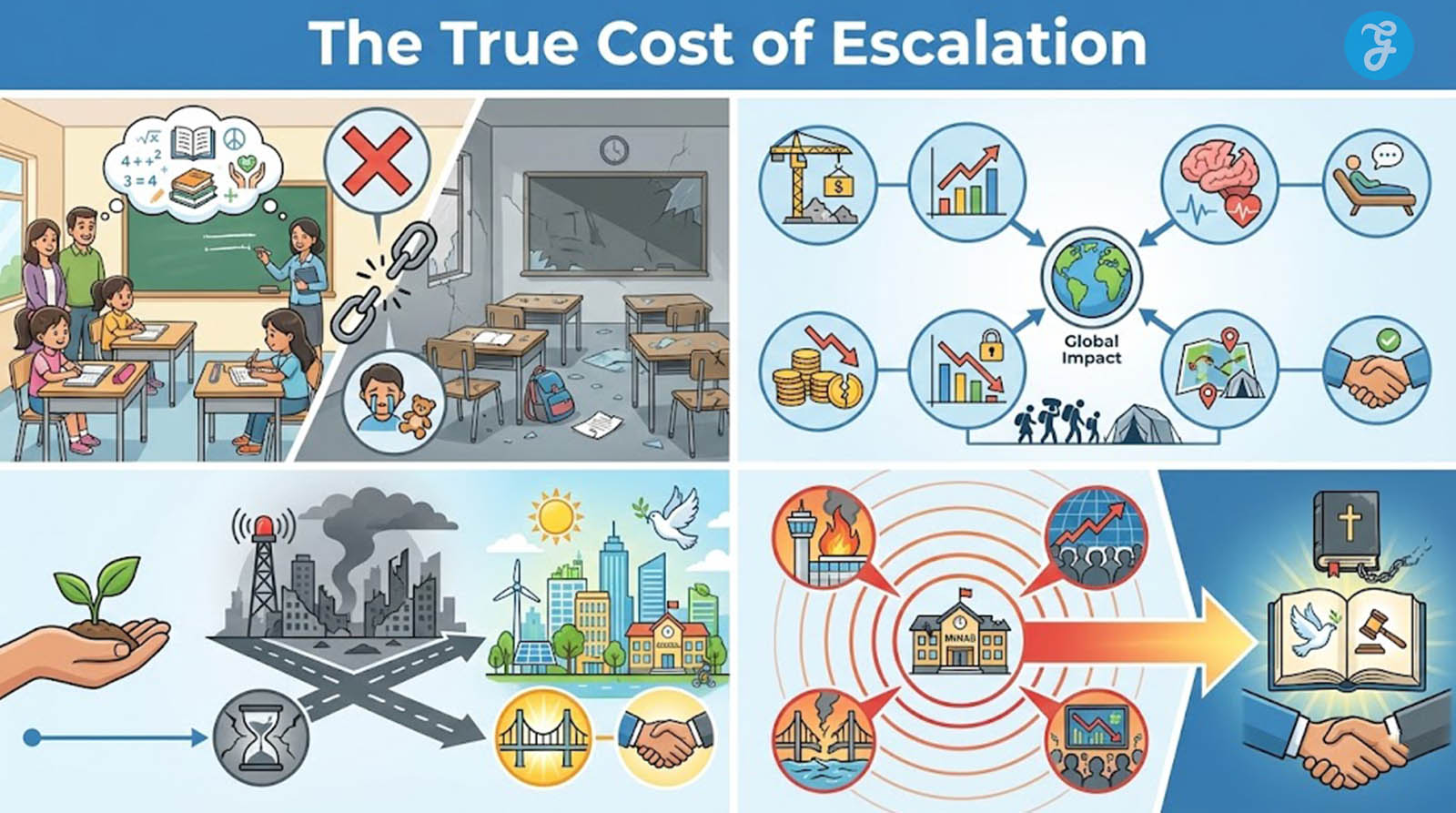 When classrooms fall silent and airports burn, the illusion of contained conflict evaporates. The damage radiates outward, from one city to the global system, from one day’s headlines to decades of consequence.