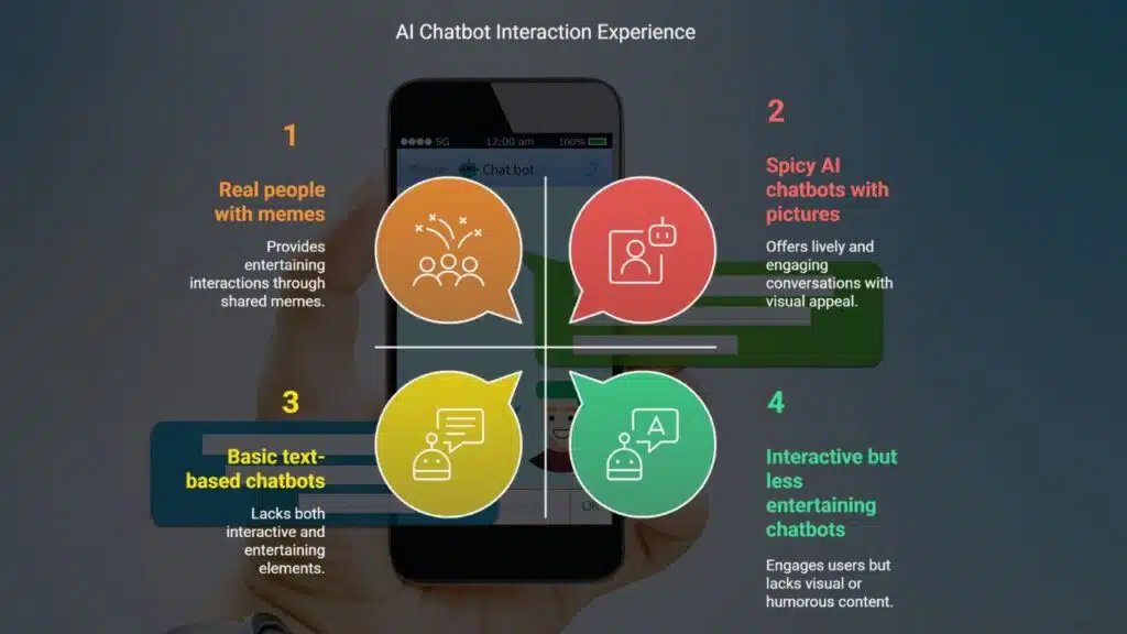 Lonely singles often seek companionship and ways to pass the time. Spicy AI chatbots with pictures provide a more interactive and entertaining experience, making conversations more lively and enjoyable. The visuals keep the interaction fresh and exciting, reducing feelings of loneliness and boredom. When talking to real people, you can send memes or receive hot pictures, and now you can do the same when talking to an NSFW AI chat with pics.