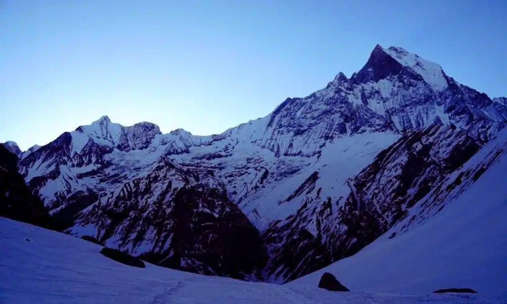 Local Gurung tribes worship Machapuchare as home of the Hindu god Shiva. Climbers are asked to respectfully stop just short of its actual summit out of spiritual deference.