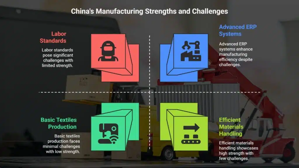 Yet challenges exist, like labor standards and environmental concerns. Despite this, China remains a key player in footwear production, ready-made garments, and electronics manufacturing.