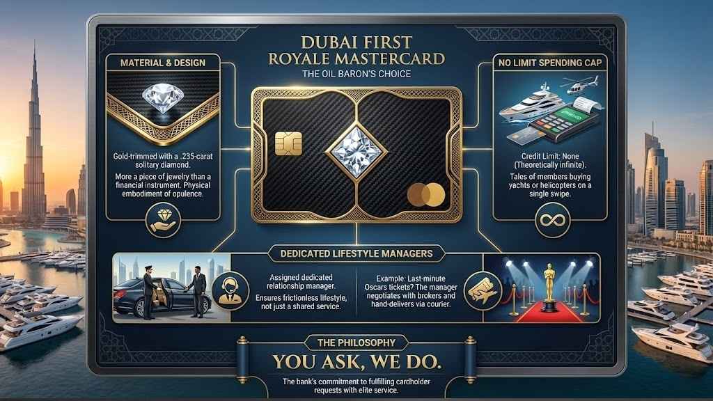 Most “no limit” cards actually have a shadow limit based on your spending history. The Dubai First Royale is rumored to be different. Tales circulate of members buying yachts or helicopters on a single swipe.