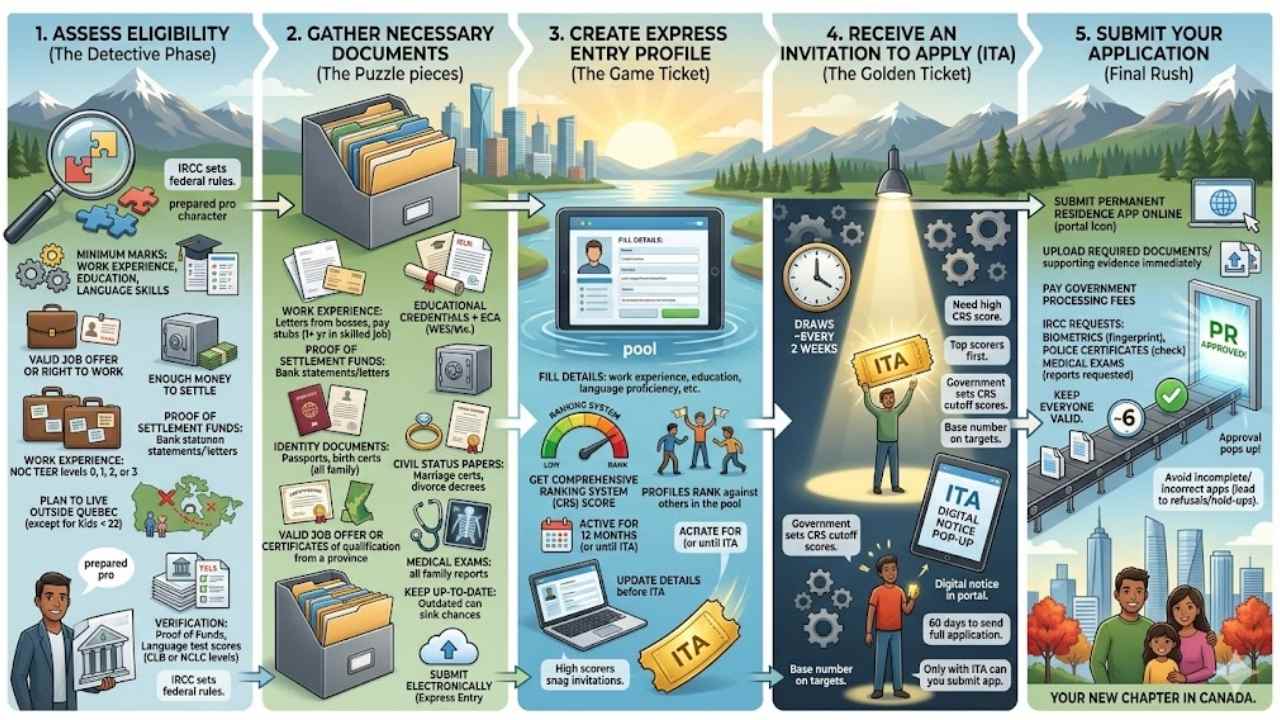 Ready to chase that Canadian dream, like packing your bags for a fresh start? Jump in by checking if you qualify, then grab your papers and build your profile in the Express Entry pool, where invites come like golden tickets to a new life.