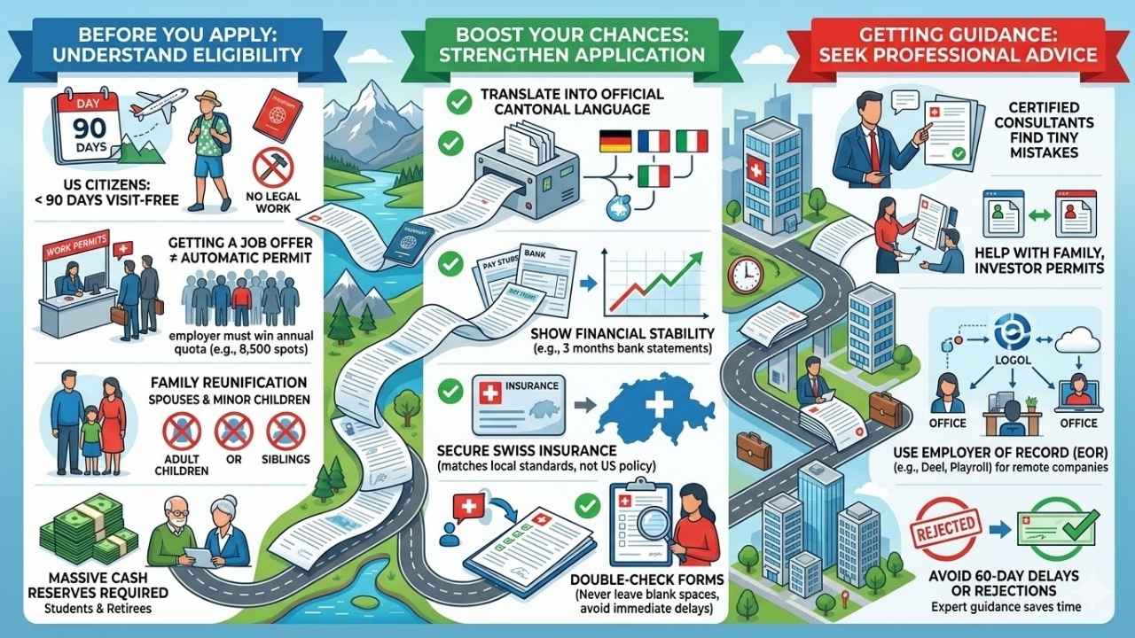 The State Secretariat for Migration does a final, rigorous check on every single application. A US citizen cannot just arrive in Zurich and start working. You need to land a job first, then pass checks at both the cantonal and federal levels.