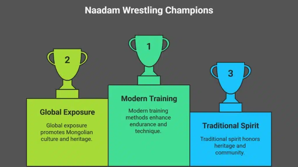 Naadam wrestlers now have a new path to follow from their ancestors. The new champions now incorporate traditional ways of training with modern ways. Diet, sports science, and even video analysis have been incorporated into the preparation phase, so endurance is just as important as technique.