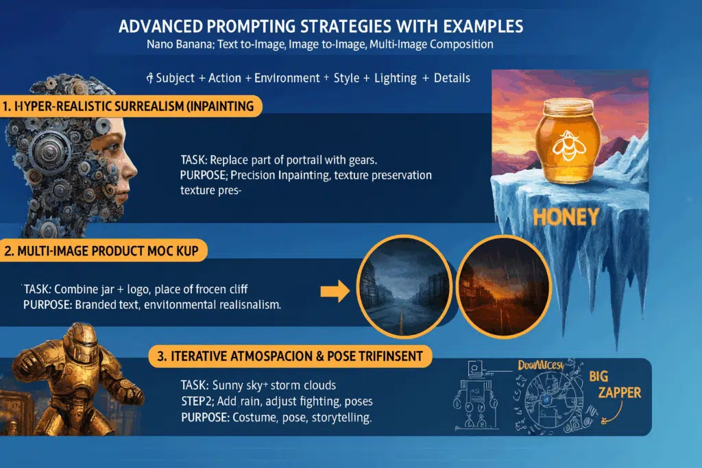 Nano Banana supports text-to-image, image-to-image, and multi-image composition. The key is structuring prompts with: