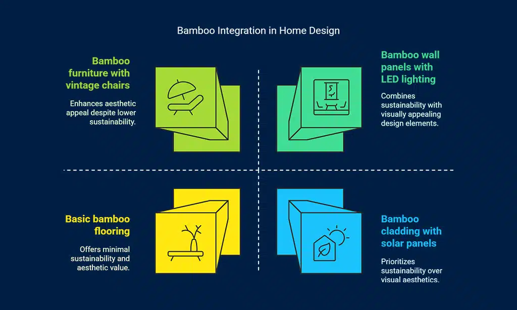 Pair bamboo wall panels with steel furniture for a fresh look. This combo works great in open floor plans or living rooms, where natural textures and smooth lines meet. Light up the space using LED bulbs above bamboo shelves, showing off both clean energy sources and style.