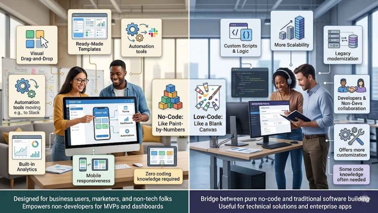 People often mix up no-code and low-code, but they serve very different purposes. No-code is like a paint-by-numbers kit, while low-code is a blank canvas that requires some technical skill.