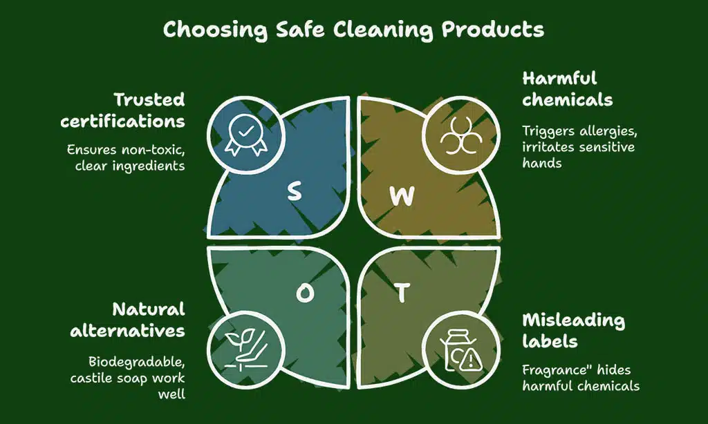 Another helpful mark is EPA Safer Choice. This shows the product meets strict safety rules set by the Environmental Protection Agency. These labels help you choose natural cleaning products that work without risking your health or harming countertops, dishes, or even your hands!