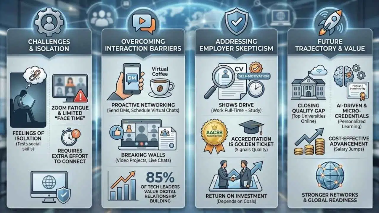 Busy professionals often worry about missing the “face time” of campus life. Today’s programs break down walls with video group projects and live chats. But “Zoom fatigue” is real.