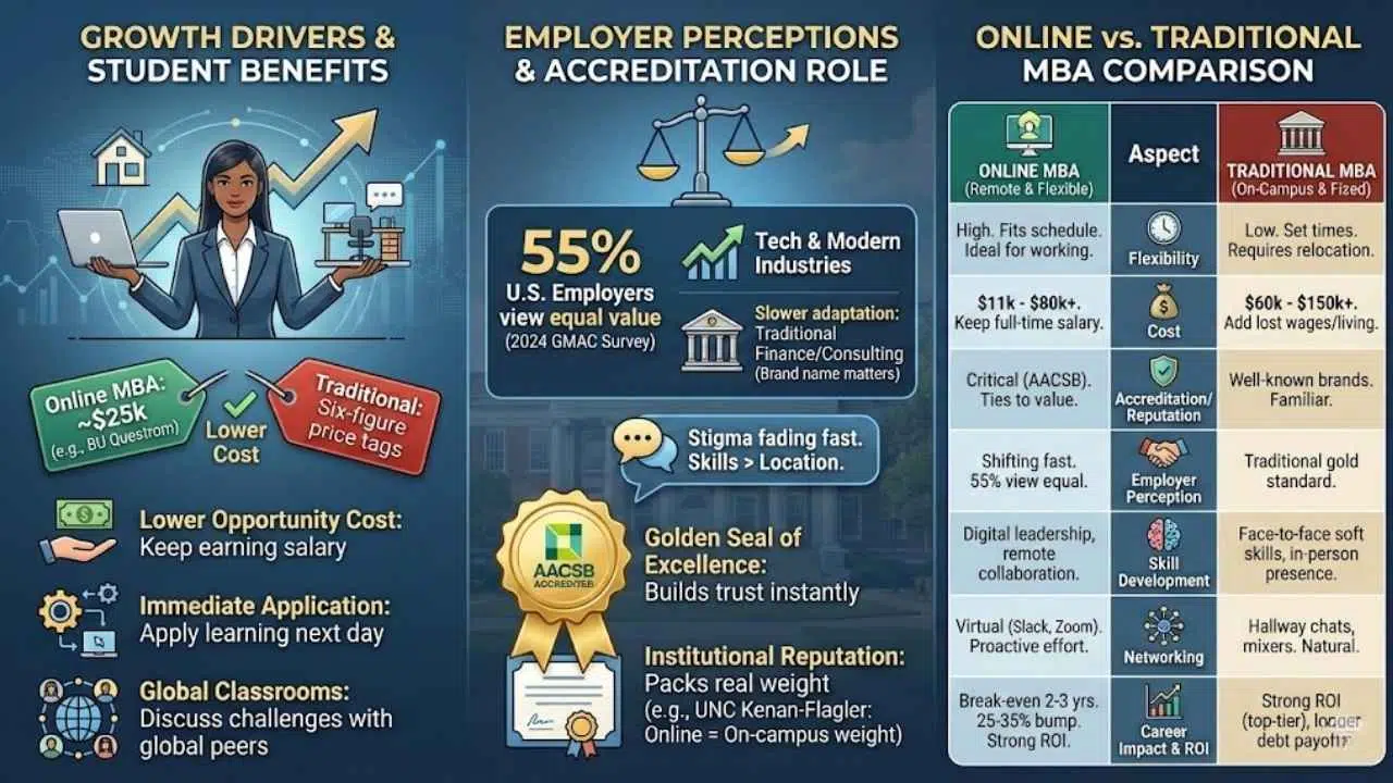 | Accreditation & Reputation | Critical to choose accredited programs (AACSB). Reputation ties directly to perceived value. | Often well-known brands. Employers are already familiar with these campus programs. |