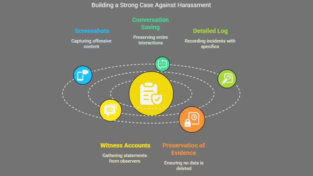 Another important requirement is to save the screenshot of the entire chat from the moment the harassing incident occurred. This clarity helps create a narrative that your lawyer can use to support your case. Prepare an incident log with times, dates, and acts, or otherwise. If there is a witness, politely encourage them to share their account.