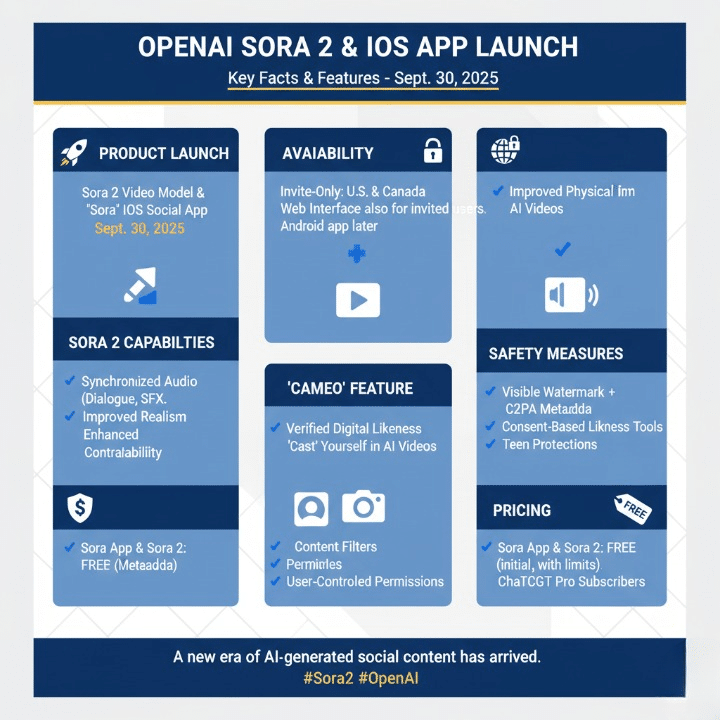 - Product Launch: OpenAI released the Sora 2 video model and a companion “Sora” social media app for iOS on September 30, 2025.