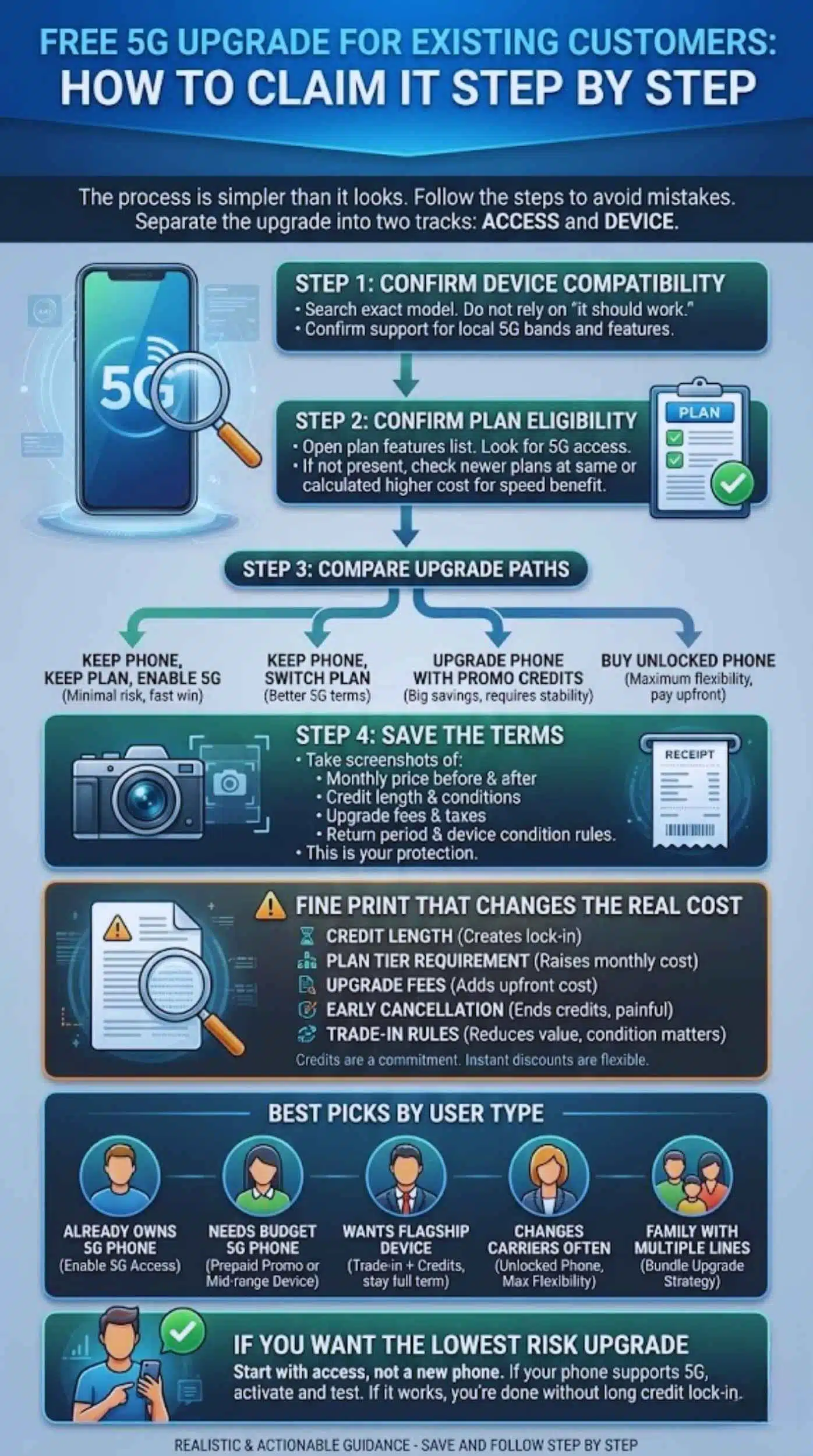 Think of your upgrade as a simple decision tree. First, confirm whether you already have what you need for 5G. Second, decide whether you want a plan change, a device change, or both. Third, calculate the real cost over the full promo period.